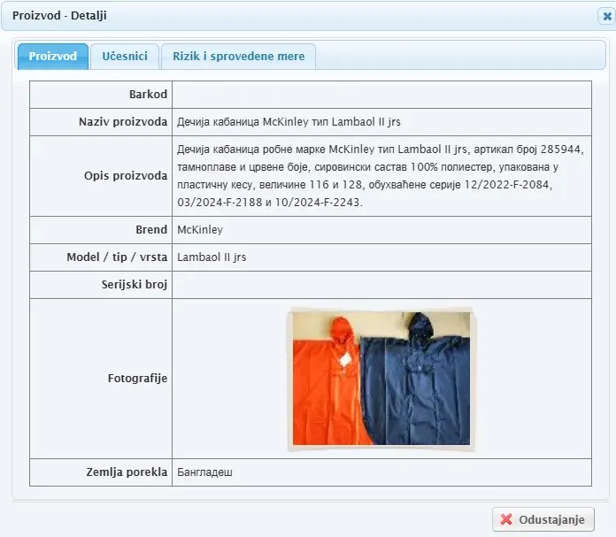 Dečja kabanica McKinley tip Lambaol II jrs povlači se sa tržišta Srbije jer se na kapuljači nalaze učkuri koji su duži od propisnih, objavljeno je na sajtu Ministarstva unutrašnje i spoljne trgovine (NEPRO).