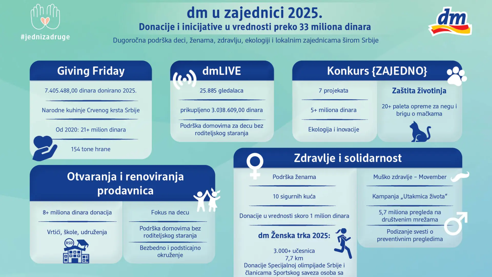 Doslednim ulaganjem u digitalne servise, logistiku i savremene formate kupovine, dm nastavlja da razvija model poslovanja u kojem su praktičnost, dostupnost i poverenje ključne vrednosti u odnosu sa kupcima.