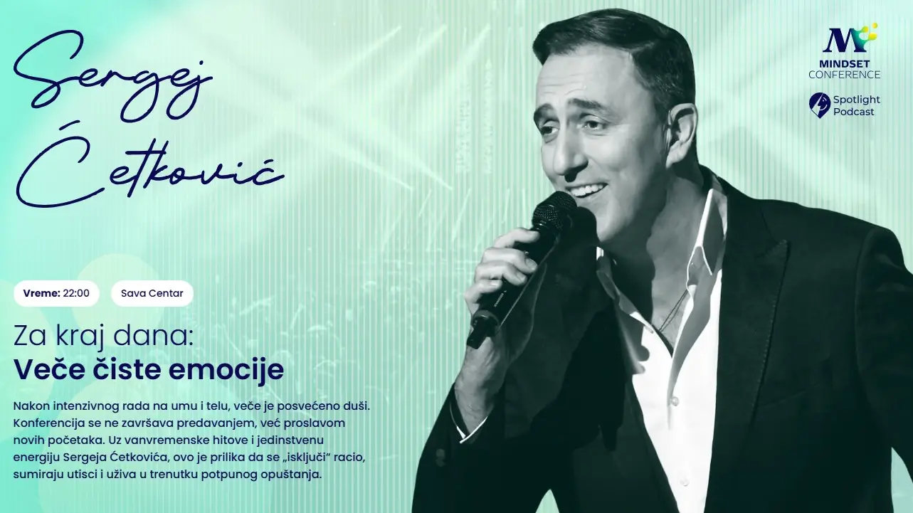Za kraj dana, posetioce očekuje VEČE ČISTE EMOCIJE. Nakon intenzivnog rada na umu i telu, veče je posvećeno i duši. Konferencija se ne završava predavanjem, već proslavom novih početaka. Uz vanvremenske hitove i jedinstvenu energiju Sergeja Ćetkovića, ovo je prilika da se „isključi“ racio, sumiraju utisci i uživa u trenutku potpunog opuštanja.