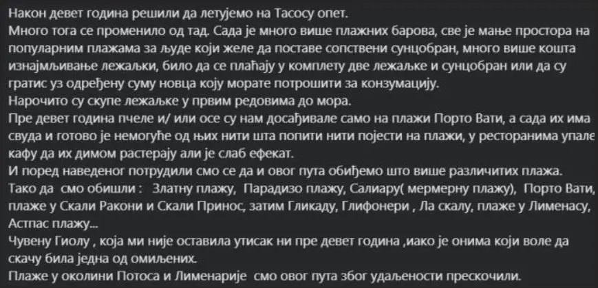 "Nakon devet godina smo rešili da letujemo opet na Tasosu. Mnogo toga se promenilo od tad. Sada je mnogo više plažnih barova, a sve je manje prostora na popularnim plažama za ljude koji žele da postave sopstveni suncobran. Mnogo više košta iznajmljivanje ležaljki, bilo da se plaćaju u kompletu dve ležaljke i suncobran ili da su gratis uz određenu sumu novca koju morate potrošiti za konzumaciju.