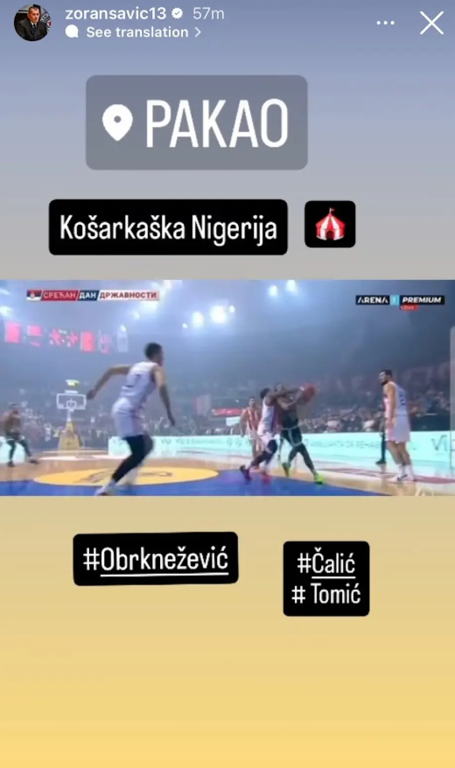 "Košarkaška Nigerija", napisao je Savić, te dodao emodži cirkusa, uz propratnu numeru "Al Kapone" od Riblje Čorbe.