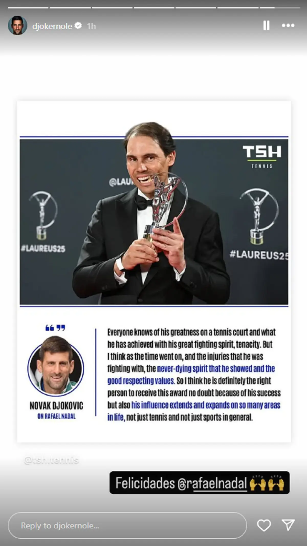 "Svi znamo koliko je veliki bio na teniskom terenu i šta je ostvario zahvaljujući svom borbenom duhu. Ali kako je vreme prolazilo, uz povrede sa kojima se nosio, pokazao je da nikada ne odustaje i vrednosti koje zaslužuju divljenje. Definitivno je prava osoba za ovu nagradu, zbog uspeha koje je ostvario, ali i zbog uticaja koji je imao na druge sfere života, ne samo tenis i sport."