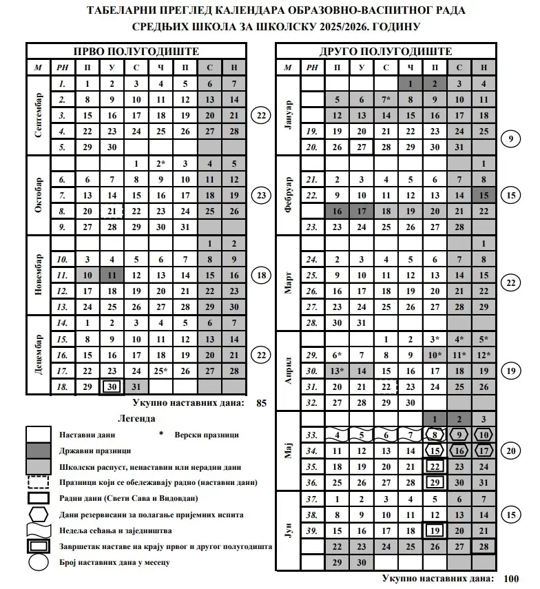 Prvo polugodište se završava u utorak, 30. decembra, a đaci će biti na zimskom raspustu od srede, 31. decembra 2025. godine, zaključno sa petkom, 16. januarom 2026. godine. Drugo polugodište počinje u ponedeljak, 19. januara 2026. godine, a za đake osnovne škole se završava u petak, 12. juna, odnosno u petak 29. maja za učenike osmog razreda.