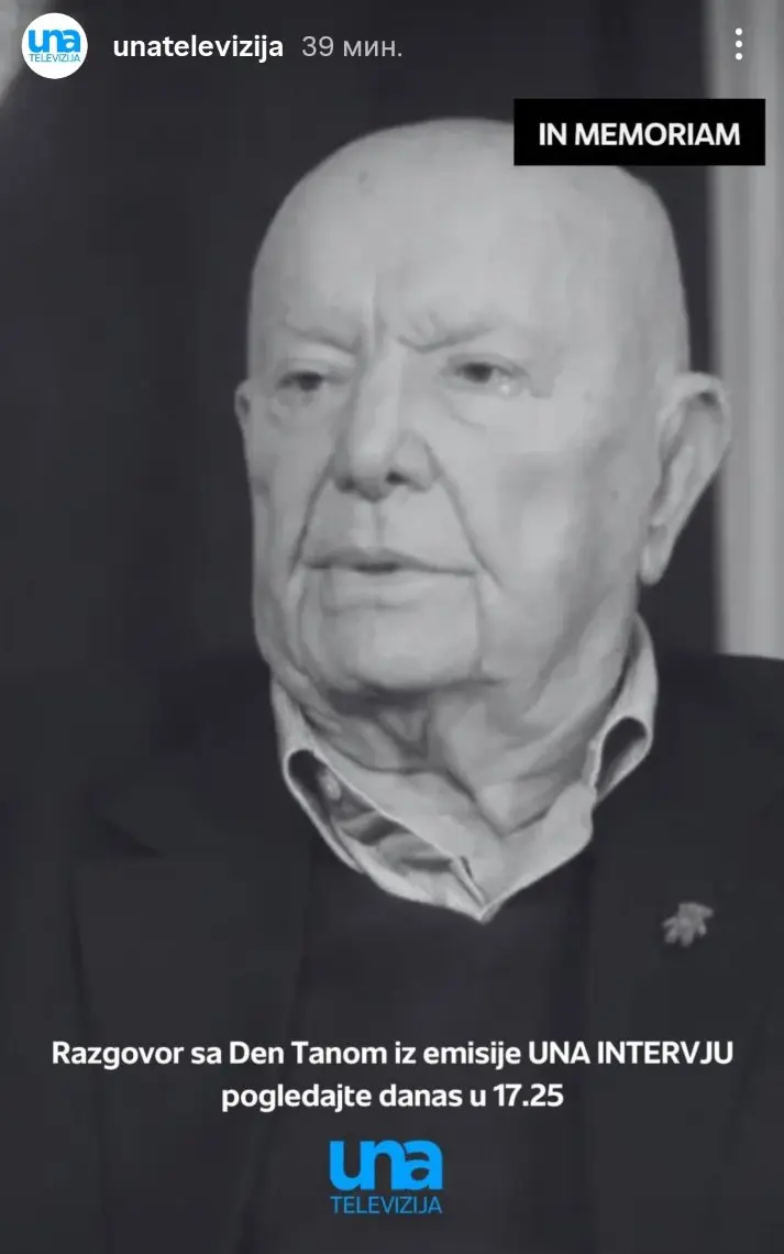 Foto: UNATelevizija UNA danas će od 17.25 časova ponovo emitovati razgovor koji je Den Tana dao u emisiji "UNA intervju" prošle godine. Da podsetimo, juče nas je sve rastužila vest da je Dobrivoje Tanasijević, poznatiji kao Den Tana, preminuo u 90. godini posle borbe sa teškom bolešću, pa je i ovo jedan od načina da odamo počast velikom sportskom radniku.