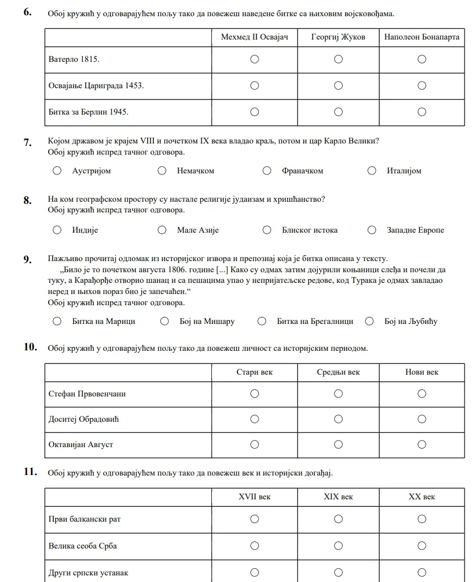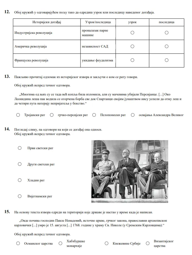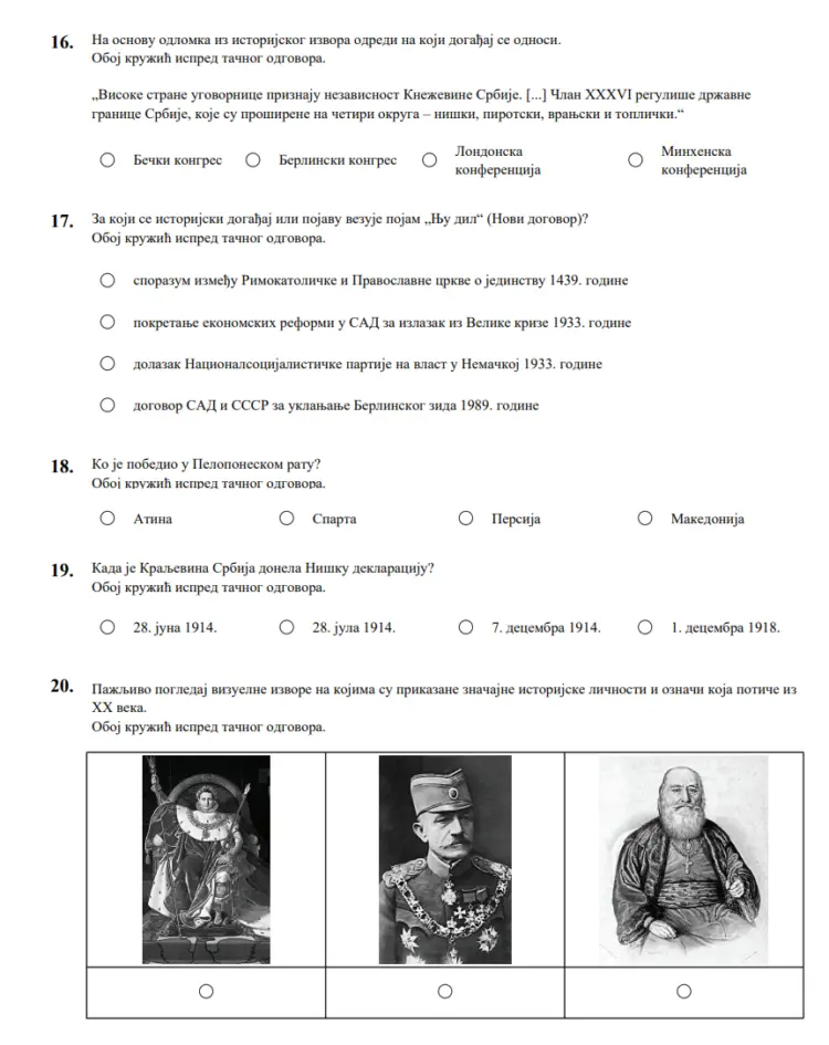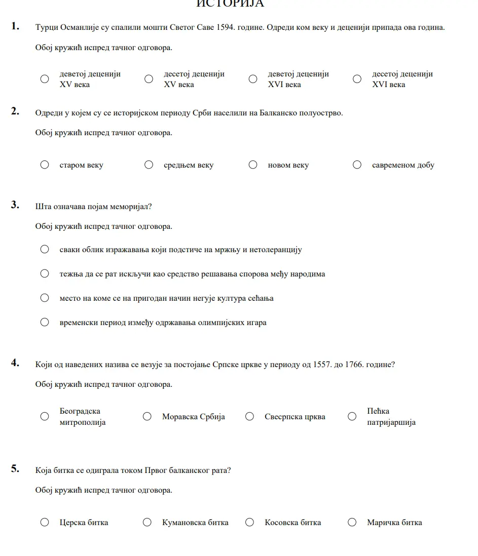 Na testu iz istorije učenici su imali 20 pitanja, a u nastavku teksta pogledajte kako je izgledao test.