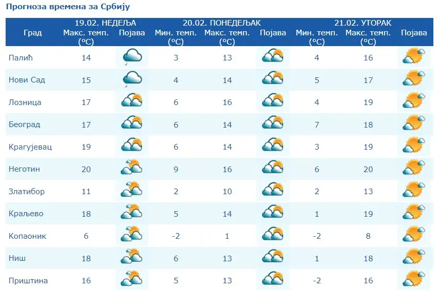 U Srbiji u utorak i u sredu ujutro vedro i hladno, ponegde sa maglom, a u južnim i centralnim predelima očekuje se i slab mraz. Tokom dana biće sunčano i veoma toplo za ovo doba godine. Jutarnja temperatura biće od minus dva na jugu do četiri stepena na severu Srbije i u Beogradu, a maksimalna dnevna biće od 15 do 20 stepeni, u Beogradu do 18, navodi meteorolog.