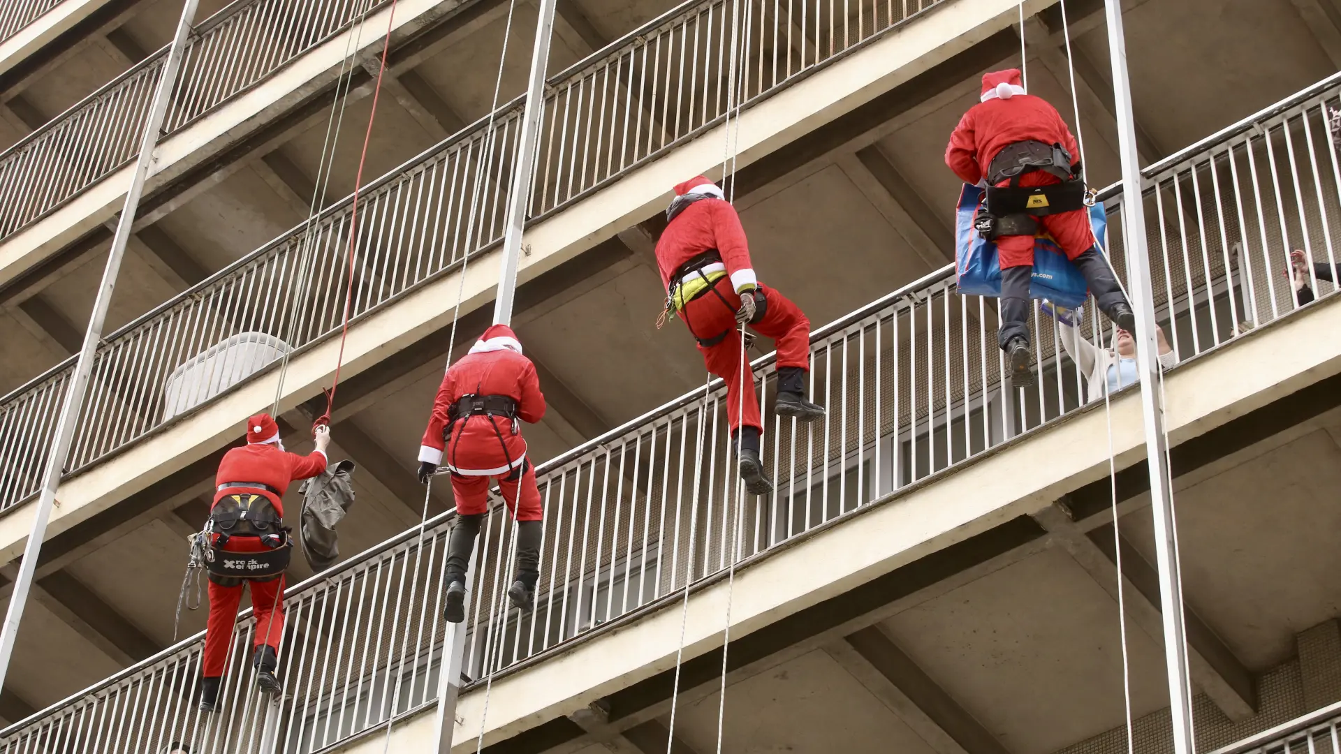 Foto: TANJUG/ DEJAN ŽIVANČEVIĆPripadnici Specijalne antiterorističke jedinice (SAJ) spustili su se jutros užadima sa krova Instituta za majku i dete obučeni kao Deda Mrazovi i obradovali poklonima mališane koji su na lečenju na Institutu.