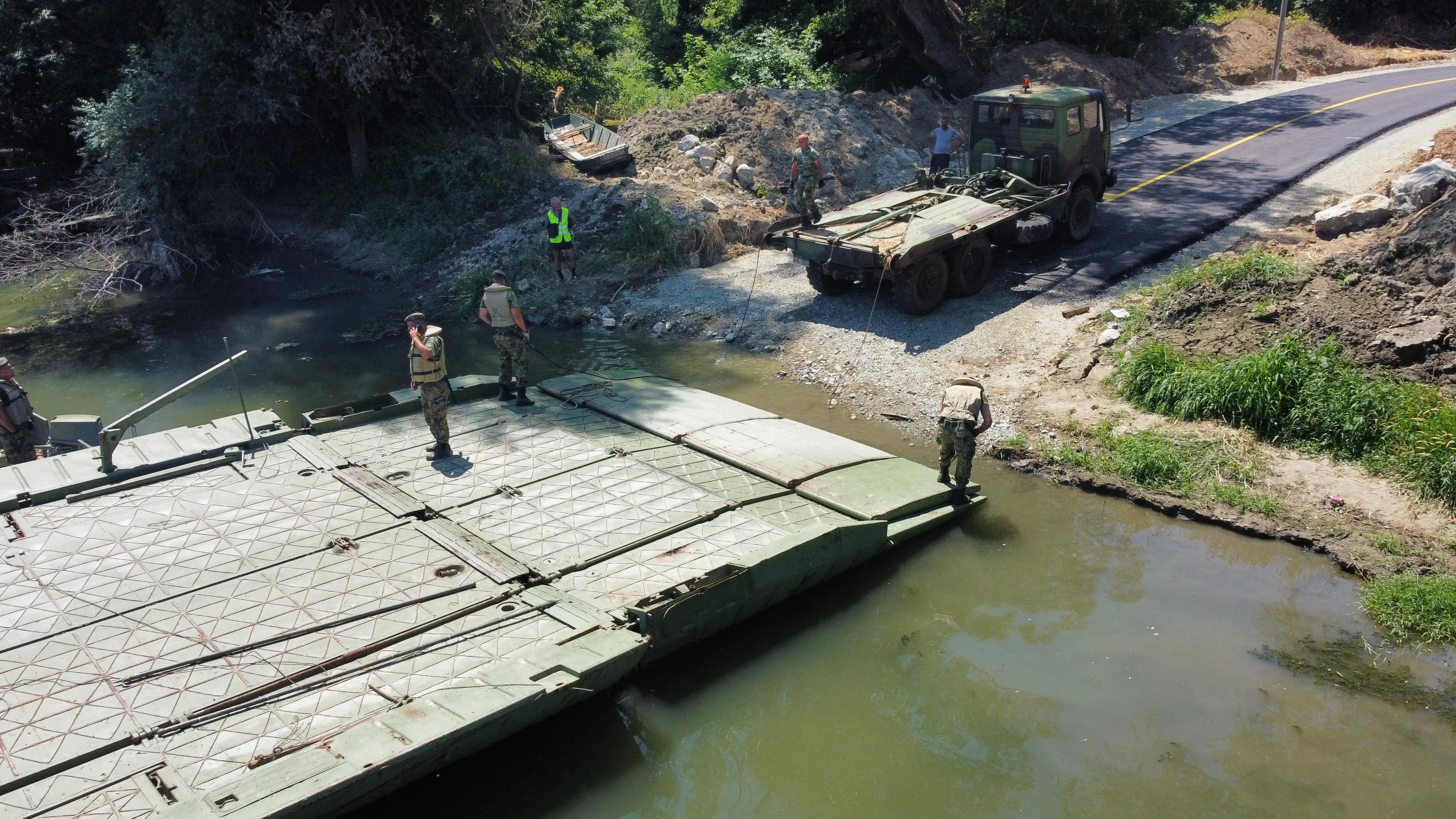Foto: TANJUG Branko LukićPontonirska jedinica Vojske Srbije postavila je pontonski most u neposrednoj blizini postojećeg, glavnog mosta preko Velike Morave, a on će se od sutra, 5. jula, koristiti za prelazak automobila preko ove reke.