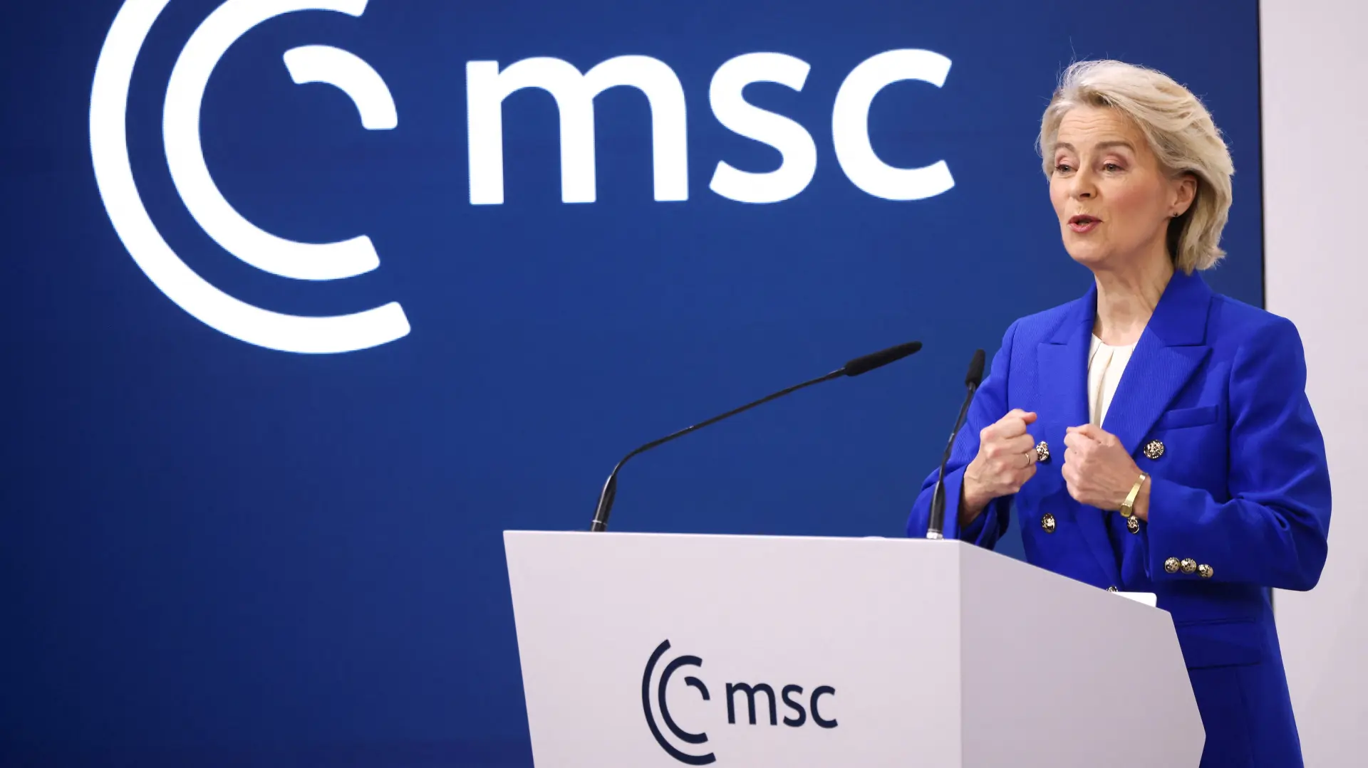 Ona je na Minhenskoj bezbednosnoj konferenciji naglasila da je Evropa suočena sa "šok terapijom" u pogledu bezbednosti i da se "budi" iz decenija zatišja, što uključuje stalne napade Rusije na Ukrajinu i pretnju spoljnih sila koje pokušavaju da oslabe EU iznutra, preneo je "Gardijan".