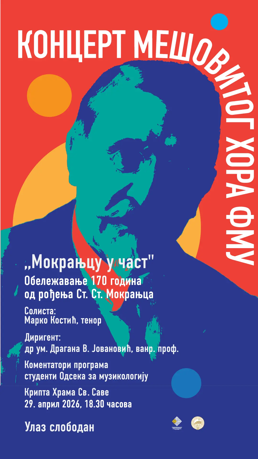 Foto: Fakultet muzičke umetnosti/PromoMešoviti hor Fakulteta muzičke umetnosti Univerziteta umetnosti u Beogradu nastupiće u kripti Hrama Svetog Save, u sredu, 29. aprila sa početkom u 18:30 časova. Pod upravom dirigenta dr um. Dragane V. Jovanović, vanr. prof, uz asistenta dirigenta Teodoru Toković, saradnika u nastavi, hor će izvesti program posvećen jednom od najznačajnijih srpskih kompozitora – Stevanu Stojanoviću Mokranjcu, povodom 170 godina od njegovog rođenja.