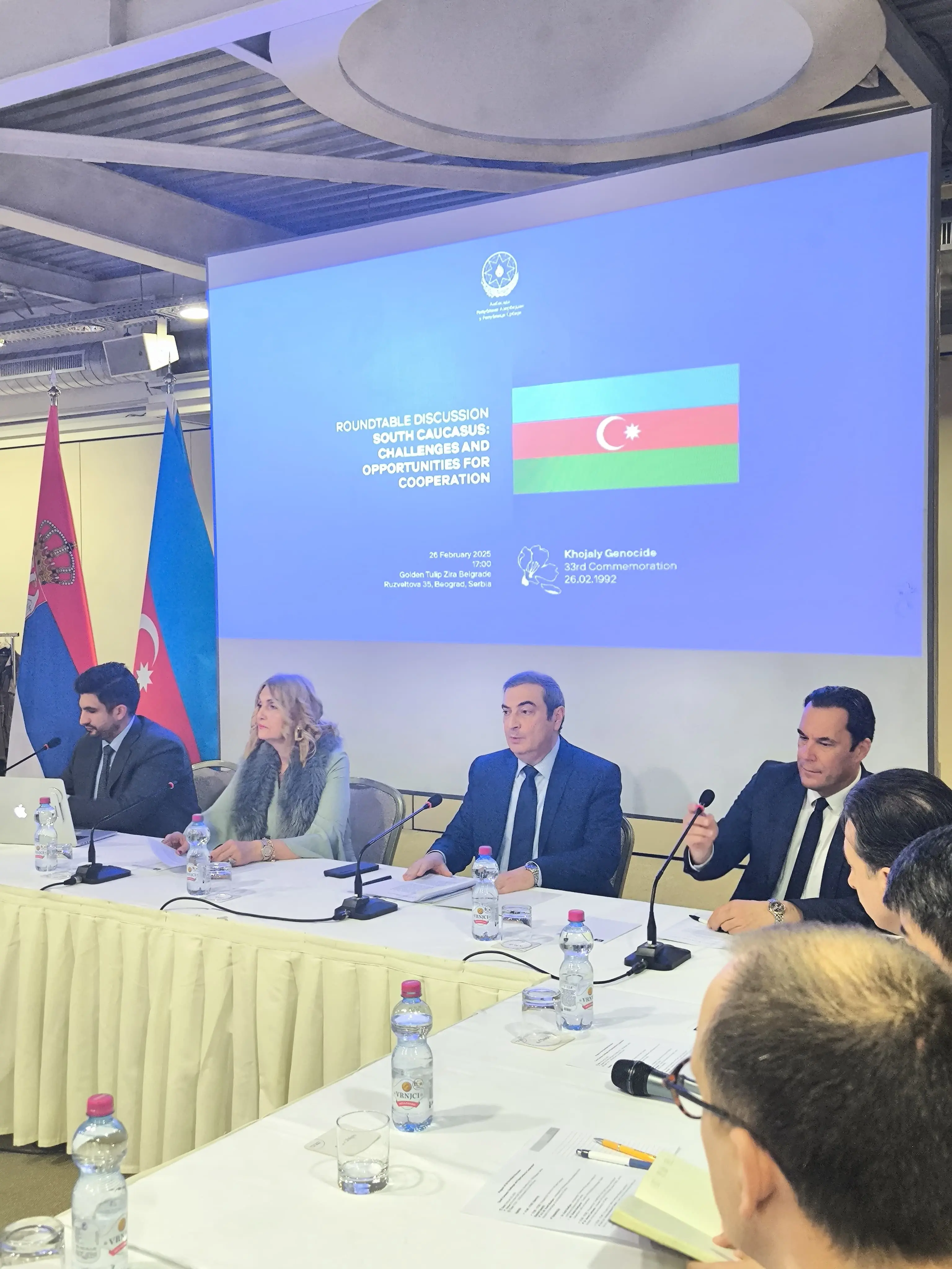 Foto: Agencija AzertagOkrugli sto na temu „Južni Kavkaz: Izazovi i mogućnosti za saradnju“ održan je u Beogradu na inicijativu Ambasade Azerbejdžana u Srbiji. Događaj je okupio diplomate, uključujući ambasadore Turske i Somalije u Srbiji, kao i savetnika Ambasade Kazahstana, zvaničnika Ministarstva spoljnih poslova Srbije, međunarodne stručnjake i političke analitičare radi diskusije o bezbednosti i mogućnostima saradnje u Južnom Kavkazu. Treba napomenuti da je događaj organizovan u čast 33. godišnjice genocida u Hodžaliju.
