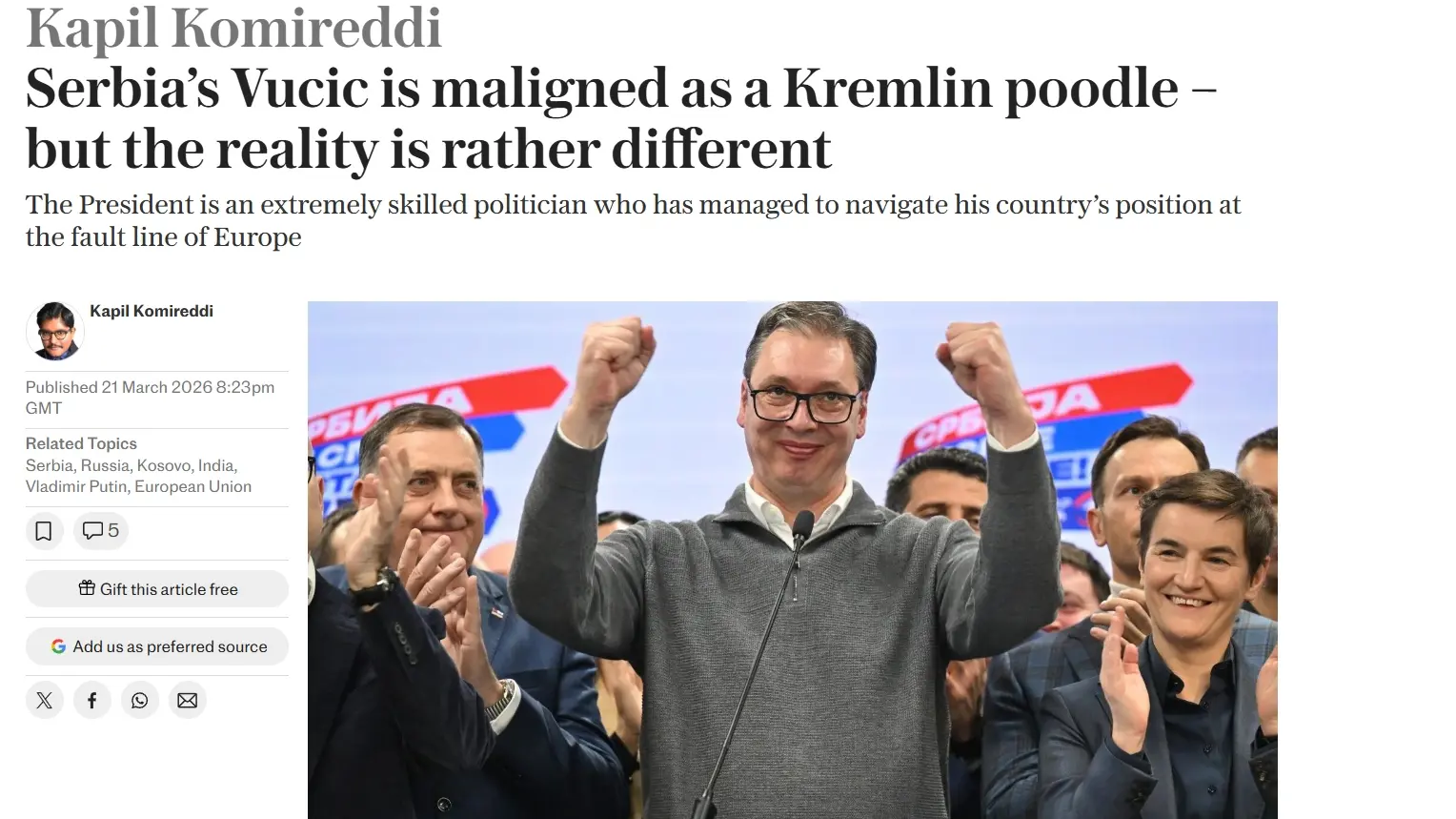 U opširnom tekstu Kapil Komiredi navodi da Vučića na Zapadu obično opisuju kao poslušnika predsednika Rusije Vladimira Putina, ali da je stvarnost sasvim drugačija.