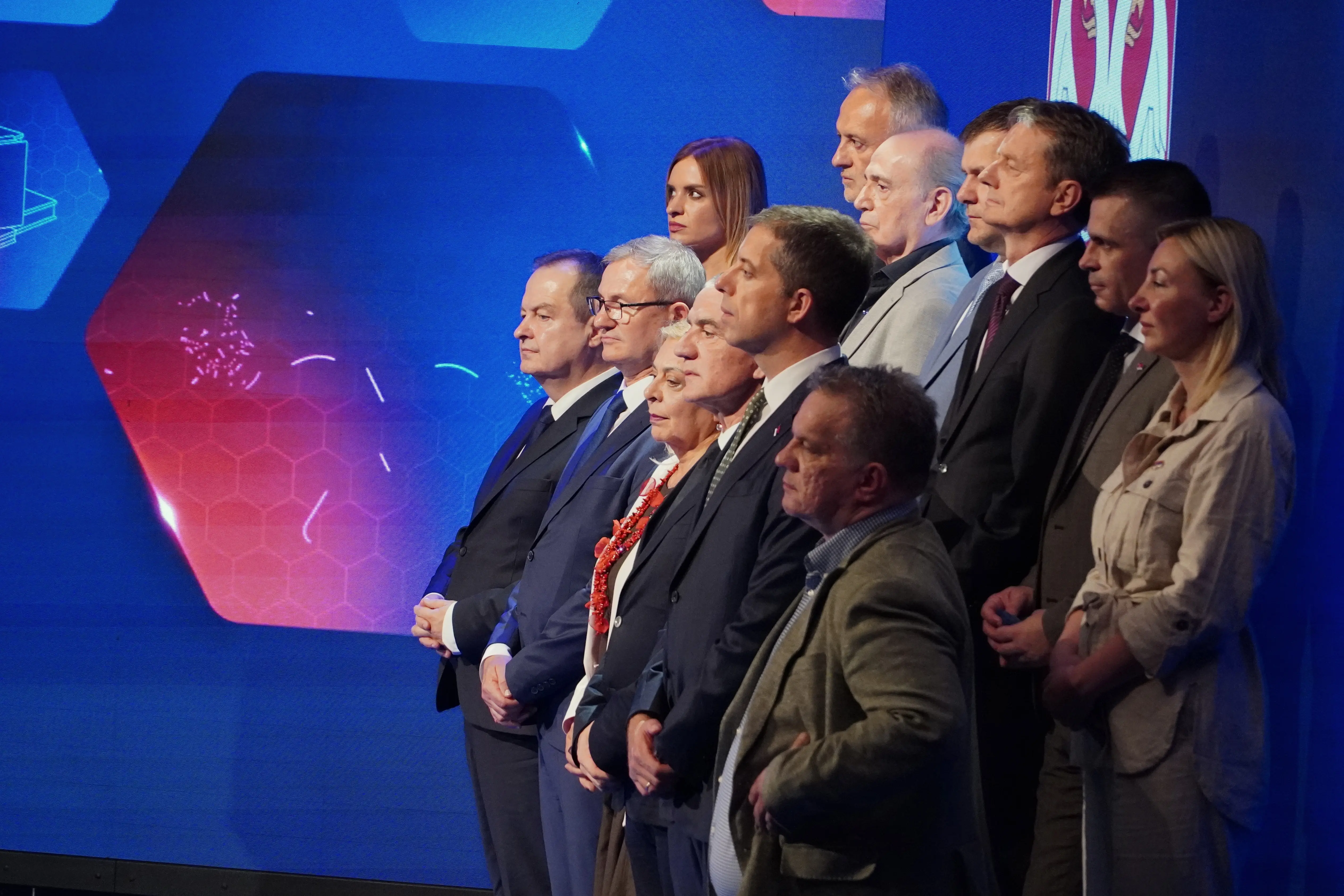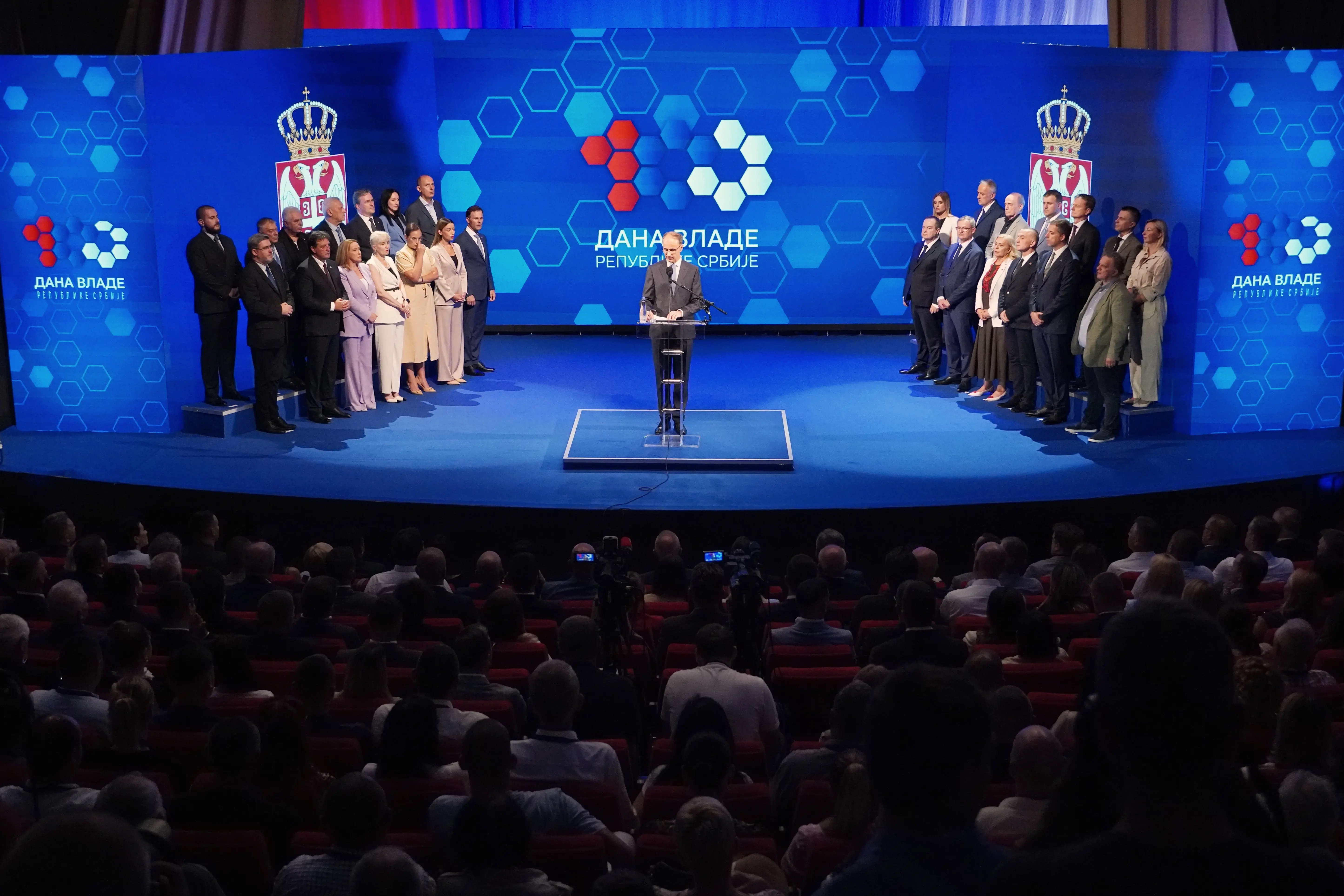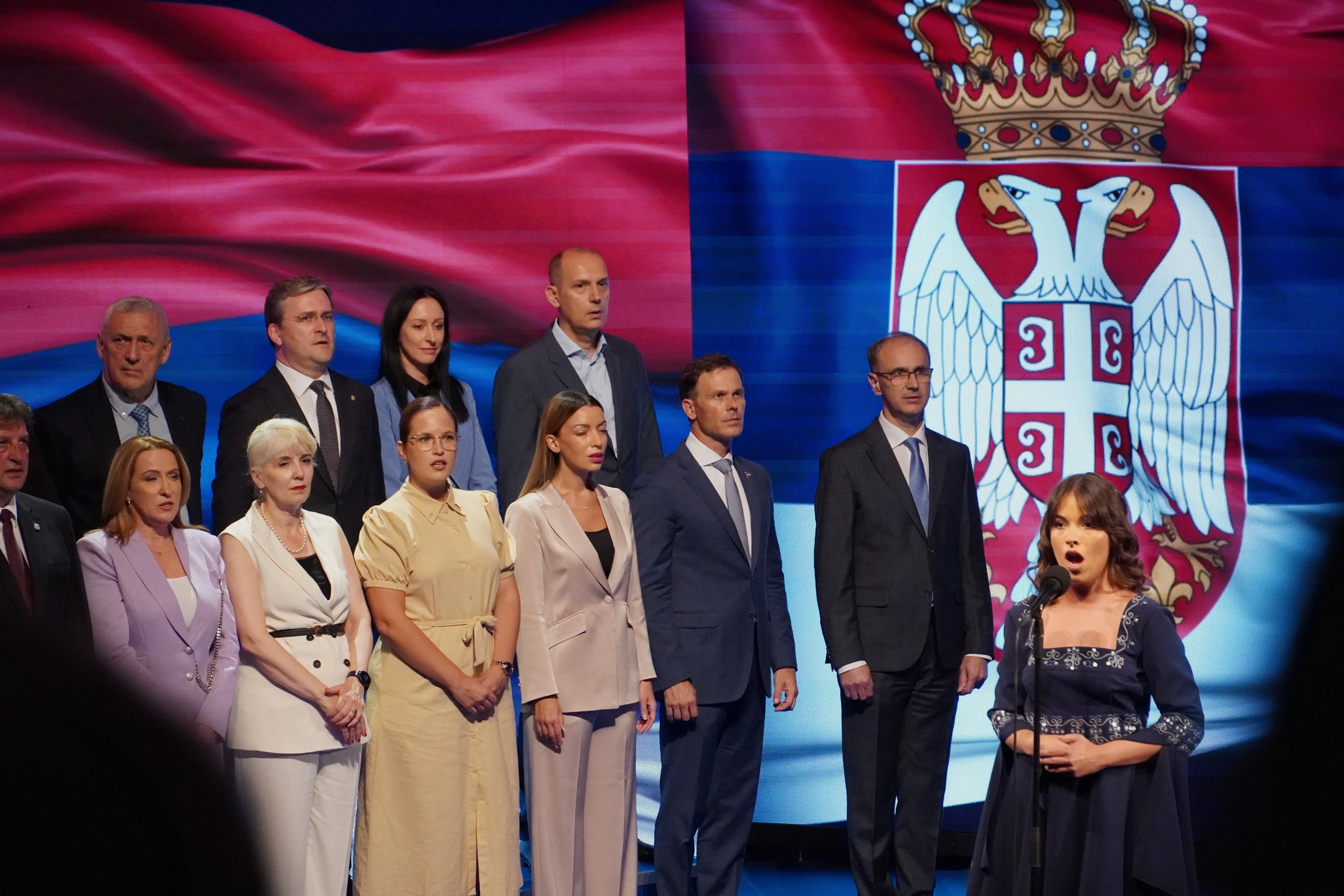 Foto: TANJUG VLADIMIR ŠPORČIĆU Domu kulture u Knjaževcu večeras je počela svečanost na kojoj premijer prof.dr Đuro Macut predstavlja rezultate rada vlade u prvih 100 dana. Na početku su, uz intoniranje himne Bože pravde, predstavljeni svi članovi Vlade Srbije. Skupština Srbije izabrala je novu vladu 16. aprila i tada su premijer i članovi kabineta položili zakletvu pred poslanicima čime je počeo da teče njihov mandat.