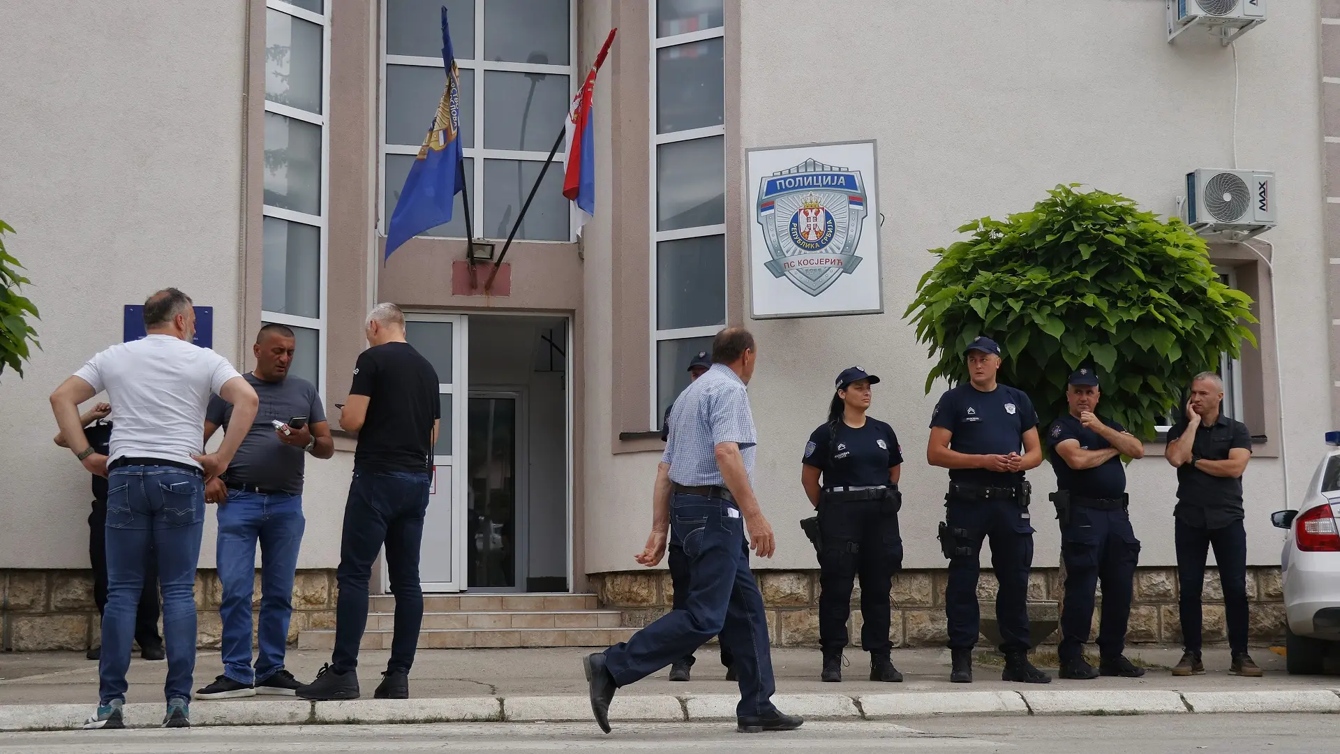 Ispred zgrade opštine Kosjerić stacionirani su pripadnici interventne jedinice policije, kao i stotinak metara dalje kod zgrade policije.