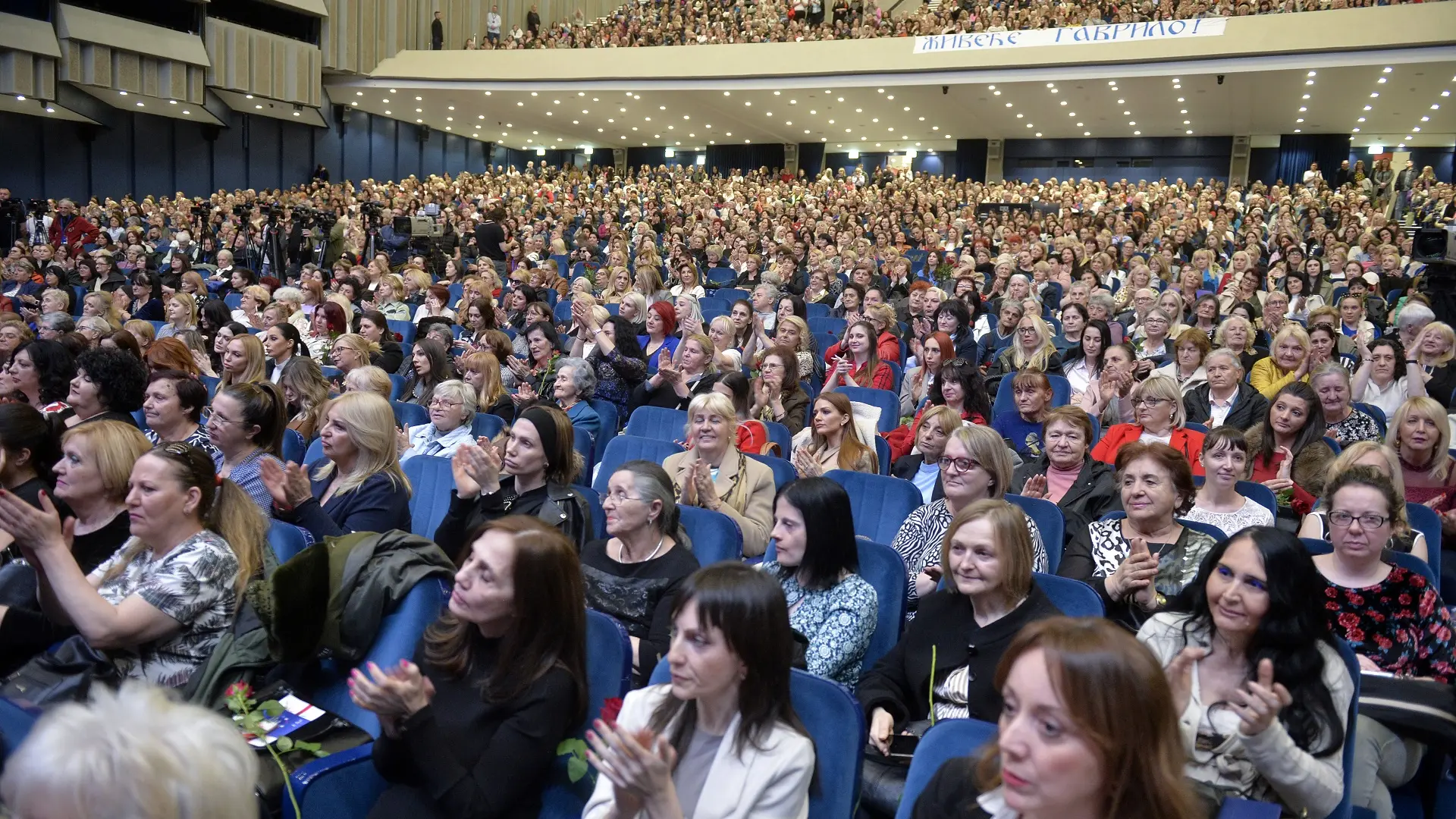 U punoj Plavoj dvorani Sava Centra najviše je žena, koje su na poklon povodom 8. marta dobile crvene ruže uz čestitku Vučića na kojoj piše - "Hvala vam što čuvate našu Srbiju".