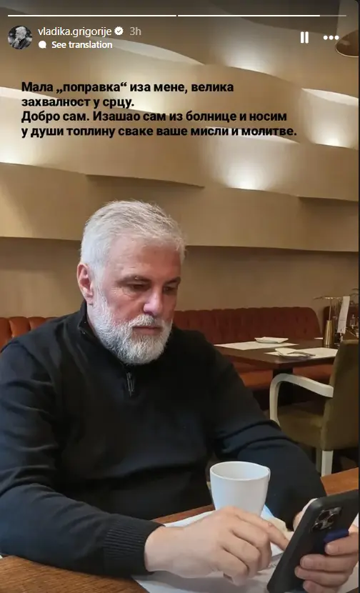 „Mala „popravka“ iza mene, velika zahvalnost u srcu. Dobro sam. Izašao sam iz bolnice i nosim u duši toplinu svake vaše misli i molitve“, napisao je Vladika Grigorije na društvenoj mreži Instagram.