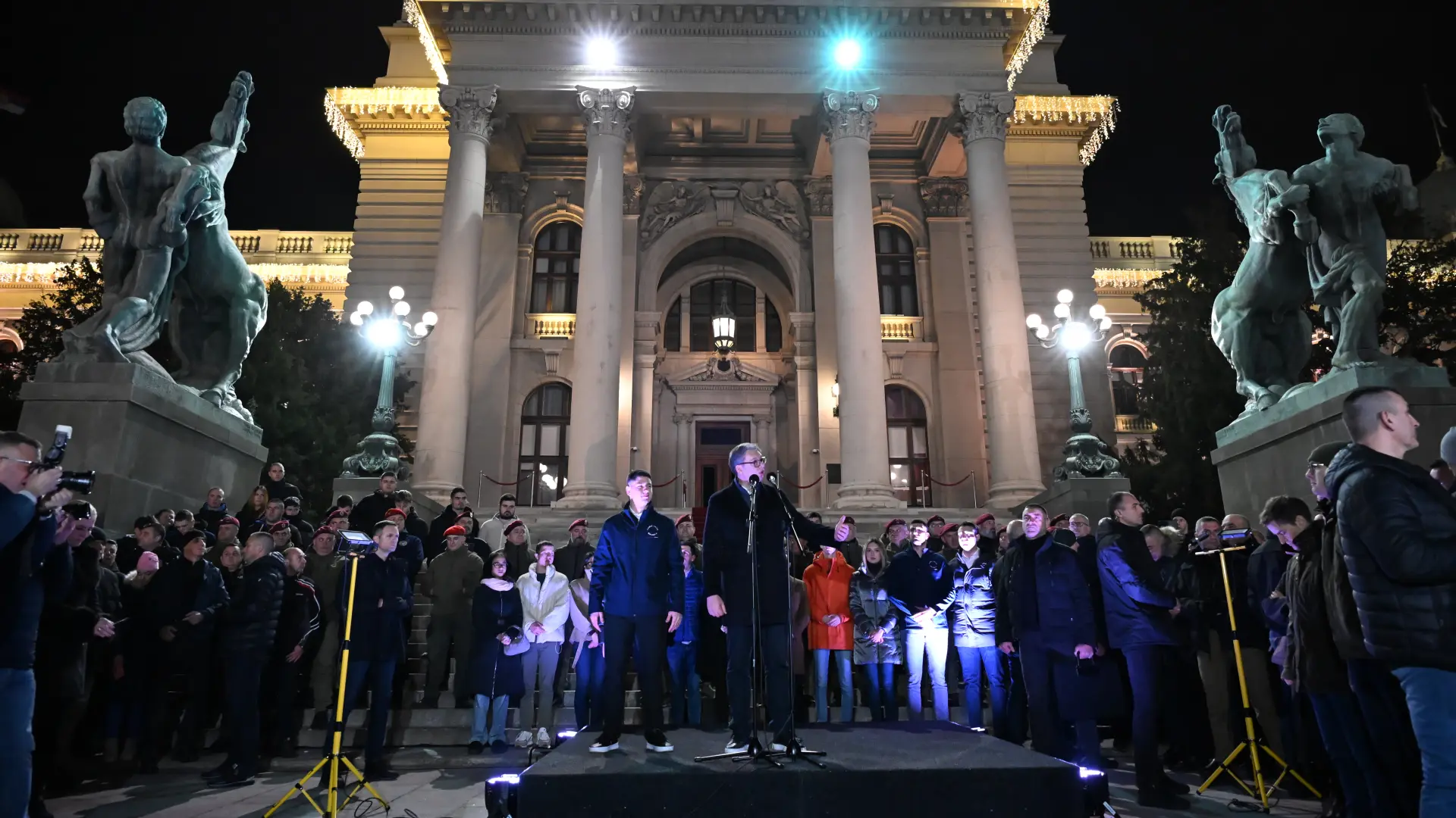 Foto: TANJUG/ ANA PAUNKOVIĆPredsednik Srbije Aleksandar Vučić je u obraćanju na platou ispred Doma Narodne skupštine rekao da se zahvaljuje svim mladim ljudima koji su pokrenuli najplemenitiju ideju postojanja suverene i nezavisne Srbije u kojoj pristojni ljudi žele da žive normalne živote. Tokom večeri se očekuje uklanjanje šatora sa platoa ispred Doma Narodne skupštine gde će tokom praznika biti postavljeno božićno selo.