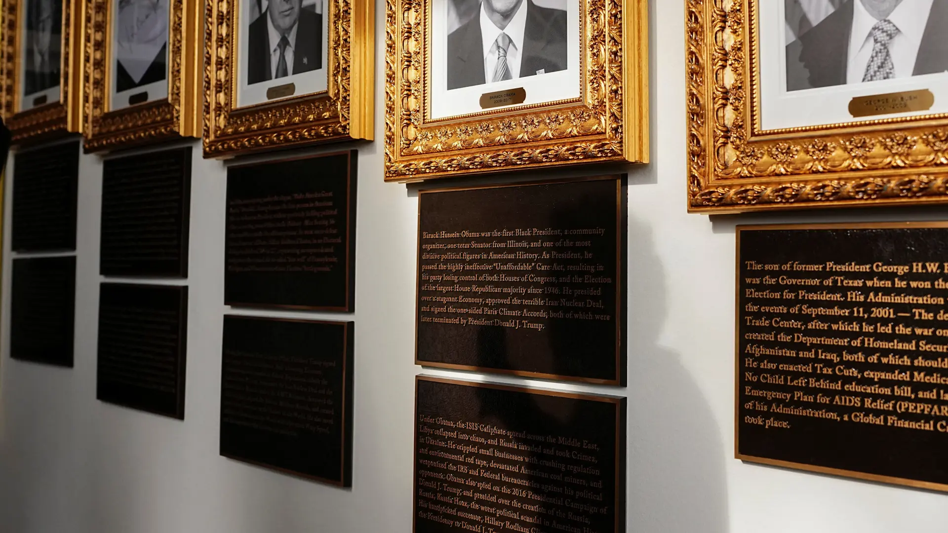 Ploča na kojoj je sam Tramp ističe njegovu pobedu iz 2024. godine, navodeći da je prevazišao "neviđeno naoružavanje organa za sprovođenje zakona" protiv njega, kao i "dva pokušaja ubistva".