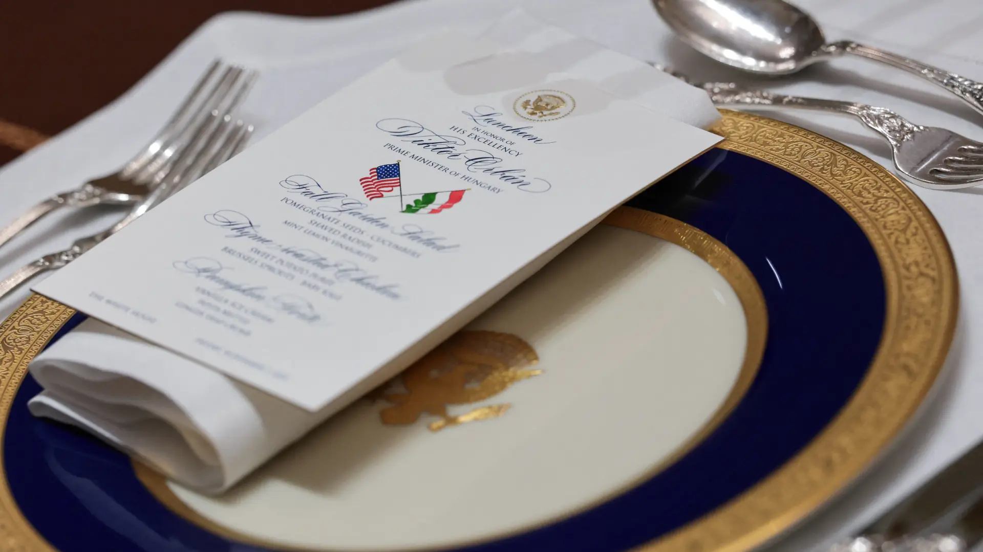 Orban i mađarska delegacija su na radnom ručku sa Trampom imali za glavno jelo pečenu piletinu sa timijanom, pire od slatkog krompira, prokelj i kelj, dok je za desert bila pita od bundeve, sladoled od vanile, krekeri od semenki bundeve i medenjaci.