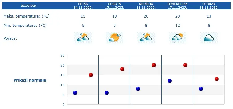"Do kraja nedelje suvo i vedro. Maglovito će biti nad Panonskom nizijom, planinskim kotlinama i duž rečnih tokova ali uz jačanje jugozapadnog vazdušnog strujanja magla i temperatura inverzija će se polako razbijati. Do petka u maglovitim predelima maksimumi oko +6 stepeni Celzijusa, a nad ostalim delom regiona od +14 do +19 stepeni Celzijusa. Za vikend svugde relativno toplo uz maksimume od +15 do +22 stepena Celzijusa.