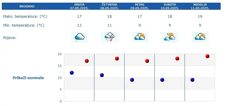 Najniža temperatura biće oko 12 stepeni, a najviša oko 17 stepeni.