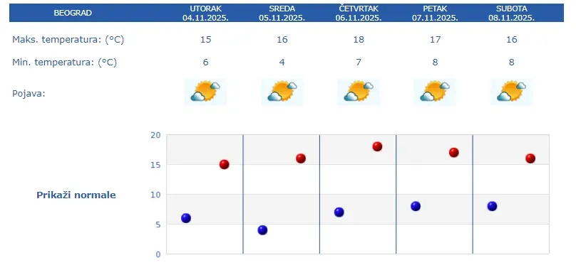 Prema izgledima vremena u Srbiji za narednih sedam dana, do 12. novembra, u četvrtak ujutro očekuje se mestimično slab prizemni mraz i to uglavnom u severnim, zapadnim i centralnim predelima Srbije, a po kotlinama i dolinama reka, kao i na zapadu Vojvodine magla.