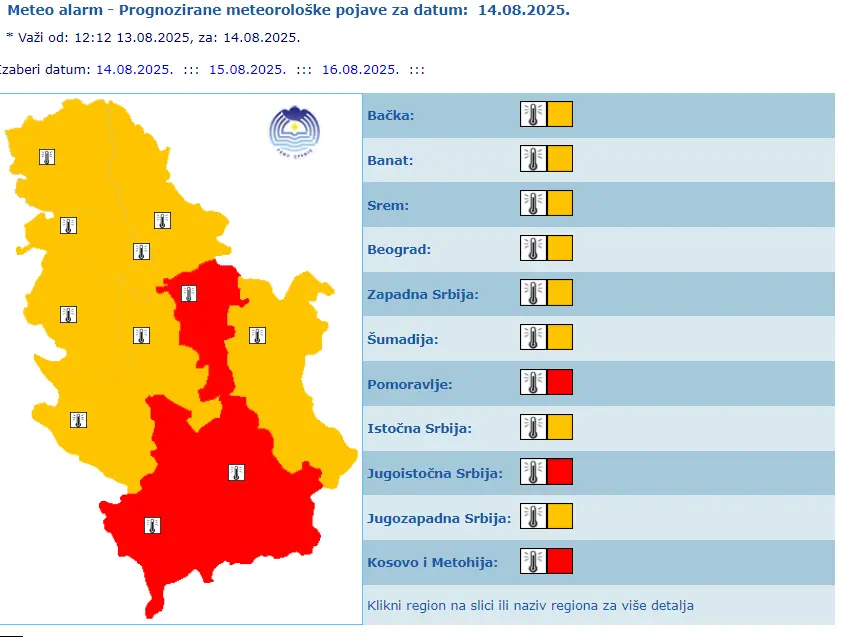 RHMZ je upozorio na visoke temperature od 11. do 17. avgusta, navodeći da će maksimalne temperature u većini mesta biti od 34 do 38 stepeni, lokalno i oko 40.