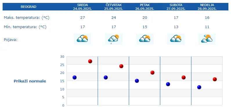 "U sredu pre podne pretežno sunčano, na severozapadu uz malu i umerenu oblačnost. Posle podne u svim predelima postepeno naoblačenje sa zapada, a uveče i tokom noći kiša i lokalni plјuskovi sa grmlјavinom očekuju se ponegde na zapadu, a uglavnom na severu Srbije. Vetar slab do umeren južni i jugoistočni, na severu Vojvodine severoistočni. Najniža temperatura od 8 do 17 stepeni Celzijusovih, a najviša dnevna od 25 na zapadu do 32 stepena Celzijusa na jugoistoku zemlјe", naveli su iz Republičkog hidrometeorološkog zavoda Srbije (RHMZ).