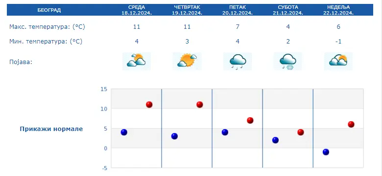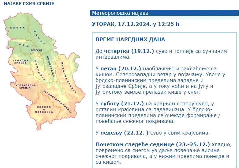 "Kiša će prvo na planinama brzo preći u susnežicu u sneg, a u nižim predelima će u subotu 20. decembra kiša prelaziti iz kiše u susnežicu. Prema današnjoj prognozi i u Beogradu se u subotu u prepodnevnim časovima očekuju pahulje. Prestanak padavina je oko podne, i u nedelju pauza, s tim što će biti znatno hladnije u odnosu na nekoliko narednih dana", kaže Ivan Ristić.