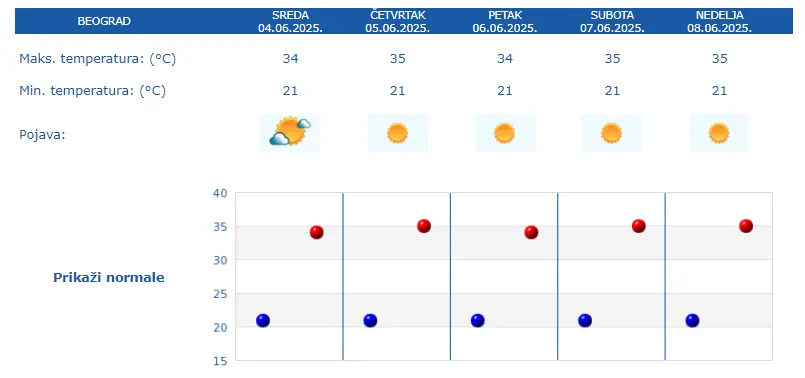 Do kraja sedmice preovlađivaće sunčano vreme sa najvišom dnevnom temperaturom od 32 do 36 stepeni, stoji u najavi RHMZ-a.