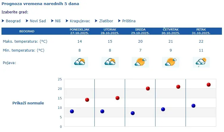 U utorak (28.10.) i dalјe prohladno uz umeren, a u Vojvodini i istočnoj Srbiji povremeno i jak severozapadni vetar. Kiša se očekuje još ujutro i pre podne na jugu i jugoistoku Srbije, a na visokim planinama padaće sneg. Tokom dana u svim krajevima suvo uz razvedravanje. Krajem dana severozapadni vetar u slablјenju i skretanju na južni. Najniža temperatura od 4 do 8 °S, a najviša od 13 do 17 °C.