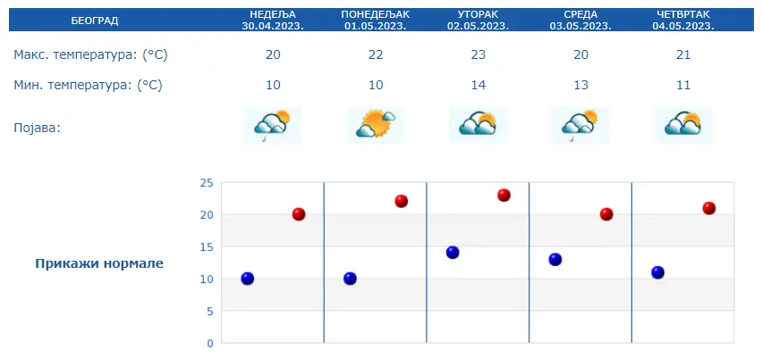 "Više padavina na više mesta tako da bi temperatura ostala slična, stepen dva niža, u sredu, četvrtak i petak. Za vikend i početak one tamo sedmice bi i dalje imali nestabilno vreme, a neku stabilizaciju vremena možemo najaviti 10. maja", naveo je Mihajlović za Tanjug.