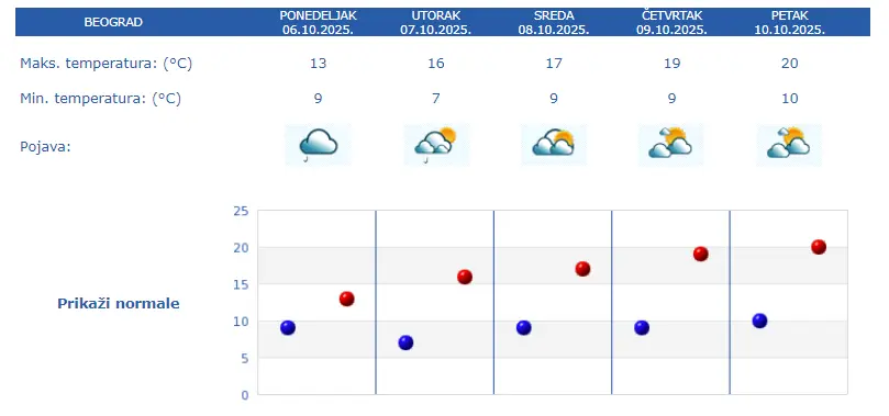 Novo naoblačenje sa kišom, prema aktuelnoj prognozi, očekuje se 13. oktobra.