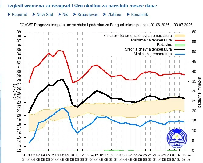 On je dodao da su dnevni maksimumi temperatura za Beograd u prvoj nedelji juna uglavnom između 33 i 35 stepeni.