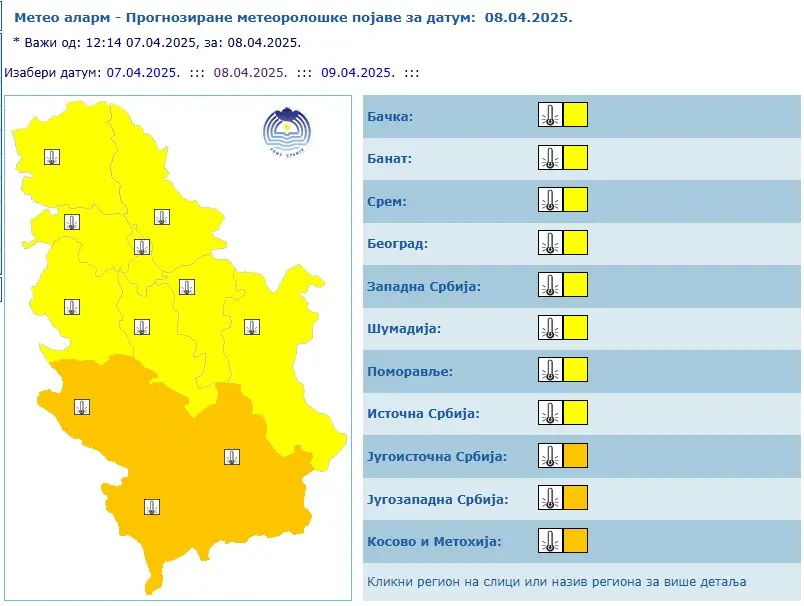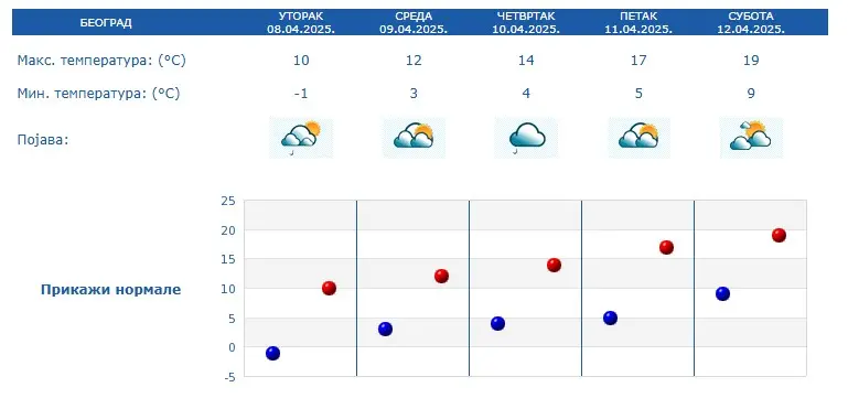 „U utorak (08.04.) ujutro vrlo hladno za ovaj period godine, u nižim predelima slab i umeren, a na planinama jak mraz. U toku dana promenlјivo oblačno sa sunčanim intervalima i u većem delu suvo. U planinskim predelima još ponegde provejavanje slabog snega. Posle podne u Vojvodini, a uveče i u toku noći i u ostalim krajevima novo prolazno naoblačenje sa severa sa prolaznim kratkotrajnim padavinama – kišom i snegom. Vetar slab i umeren, severozapadni. Najniža temperatura u nižim predelima od -7 do 0 °C (na 2 m visine), pri tlu (na 5 cm) i do -9 °C, a na planinama oko i malo ispod -10 °C. Najviša temperatura od 6 do 12 °C“, stoji u najavi.