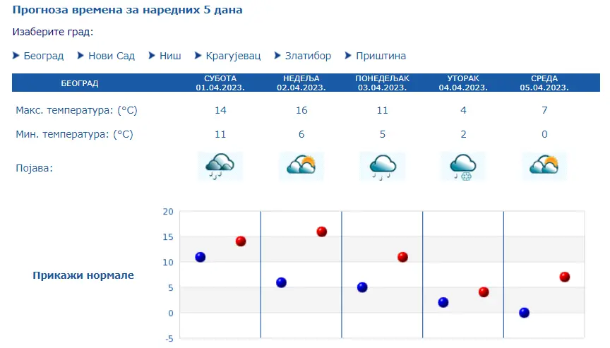 Prema izgledima vremena za narednih sedam dana, do subote, 8. aprila, u nedelju promenljivo oblačno i nestabilno, mestimično sa kišom i lokalnim pljuskovima ponegde praćenim grmljavinom.