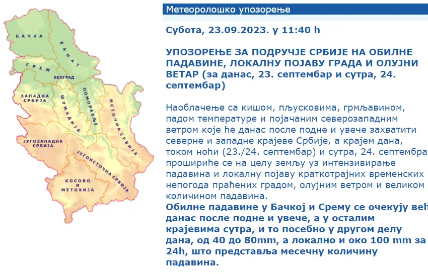 Kako stoji na sajtu RHMZ, upozorenje je za područje Srema i Bačke, objavljeno u 16 sati.