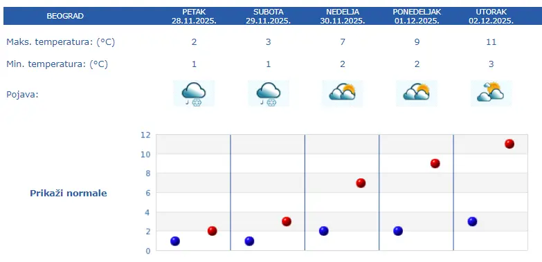 U brdsko-planinskim predelima do subote, 29. novembra, očekuje se povremeno sneg jačeg intenziteta, koji će usloviti smanjenu vidljivost, kao i zadržavanje snežnog pokrivača na kolovozu.