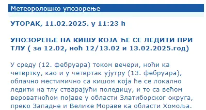 Tokom večeri i noći kiša će se lokalno lediti na tlu i to sa većom verovatnoćom u oblasti Zlatiborskog okruga, preko Zapadne i Velike Morave ka oblasti Homolja.
