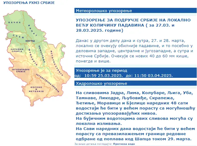 Podsetimo, Republički hidrometeorološki zavod izdao je jutros upozorenje za područje Srbije na lokalno veću količinu padavina, a na snazi je i hidrološko upozorenje zbog porasta vodostaja pojedinih tokova.