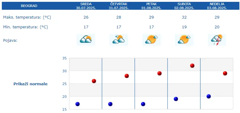 Narednih dana, do kraja sedmice, pretežno sunčano i postepeno toplije vreme. Međutim, u nedelju u drugom delu dana očekuje se naoblačenje sa zapada koje će doneti kišu, pljuskove i grmljavinu, koje će se u ponedeljak proširiti i na ostale predele naše zemlje.
