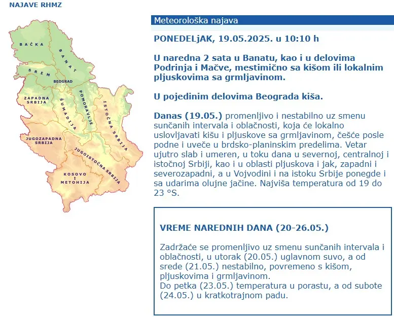 Danas promenlјivo i nestabilno uz smenu sunčanih intervala i oblačnosti, koja će lokalno uslovlјavati kišu i plјuskove sa grmlјavinom, češće posle podne i uveče u brdsko-planinskim predelima. Vetar ujutro slab i umeren, u toku dana u severnoj, centralnoj i istočnoj Srbiji, kao i u oblasti plјuskova i jak, zapadni i severozapadni, a u Vojvodini i na istoku Srbije ponegde i sa udarima olujne jačine.