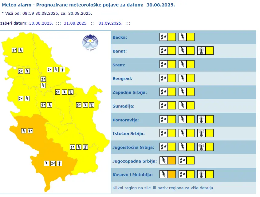 Kako stoji na sajtu Republičkog hidrometeorološkog zavoda, plјuskovi i grmlјavine, koji se na području Srbije očekuju danas i sutra (30. i 31.08.), lokalno će biti izraženiji, dok je rizik od pojave grada moguć danas (30.08.) u jugozapadnoj i južnoj Srbiji.