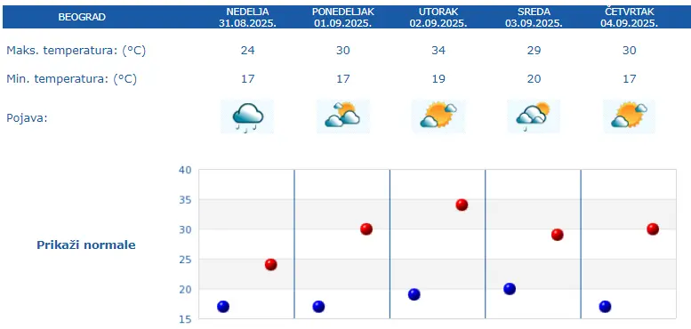U nedelјu (31.08.) promenlјivo i pretežno oblačno i svežije, mestimično sa kišom i lokalnim plјuskovima sa grmlјavinom koji ponegde mogu biti izraženiji. Vetar slab i umeren, sredinom dana i posle podne i pojačan zapadni i severozapadni. Najniža temperatura od 14 do 18 °C, a najviša od 22 do 27 °C.
