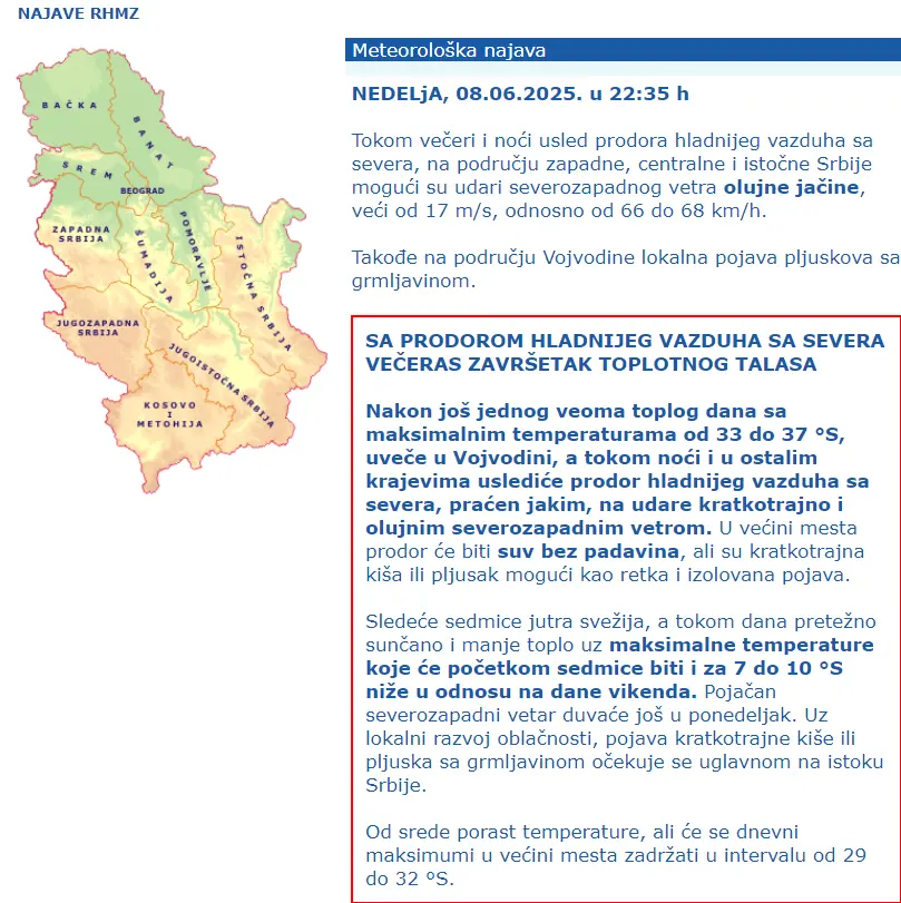 U većini mesta prodor hladnijeg vazduha će biti suv bez padavina, ali su kratkotrajna kiša ili pljusak mogući kao retka i izolovana pojava.
