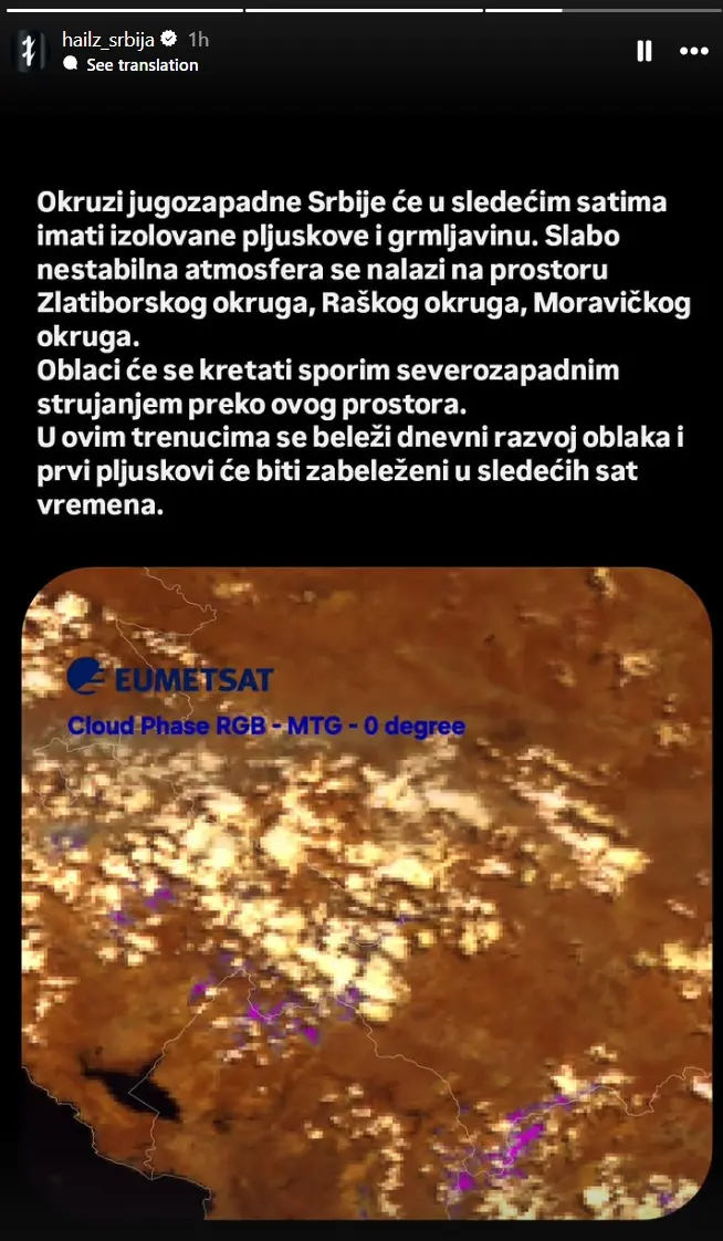 Prema njihovim navodima, nestabilna atmosfera trenutno je prisutna nad Zlatiborskim, Raškim i Moravičkim okrugom, gde se tokom dana razvija oblačnost koja će usloviti prve padavine. Oblaci će se kretati sporim severozapadnim strujanjem, pa se lokalni pljuskovi očekuju vrlo brzo.