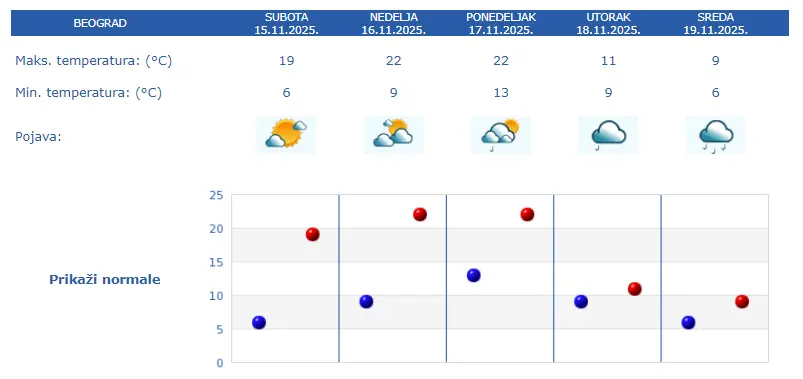 "Biće prijatno, toplo vreme do ponedeljka 17. novembra, onda sledi promena u noći između ponedeljka i utorka. Do tada će maksimalne temperature biti između 18 i 23 stepena. U Beogradu negde 20, 21, možda i 22", rekao je Todorović za Tanjug.