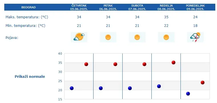 Do kraja nedelje očekuju se temperature do 36 stepeni i tropske noći u centralnim delovima Beograda kao i ponegde u Vojvodini, od ponedeljka se očekuje kratkotrajan pad temperature.