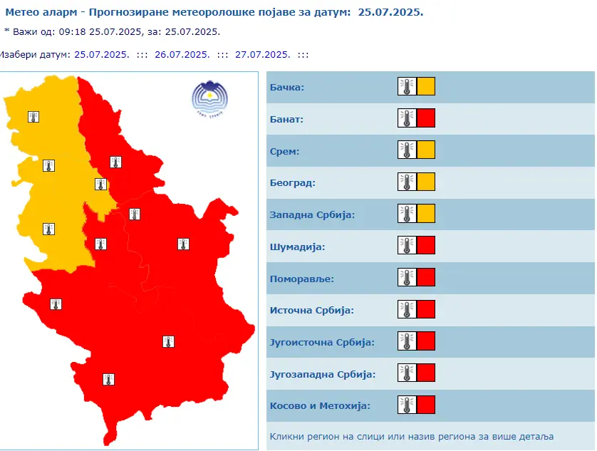 Na gotovo celoj teritoriji zemlje je zbog ektremno visokih temperatura i dalje na snazi crveni meteo alarm, koji upozorava da vreme može biti vrlo opasno.
