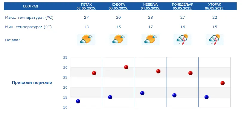 Najavio je da se krajem maja očekuje postepeno smirivanje i poboljšanje vremena, kao i sve ređi pljuskovi, dok će se temperatura ponovo kretati u intervalu od 23 do 27 stepeni.